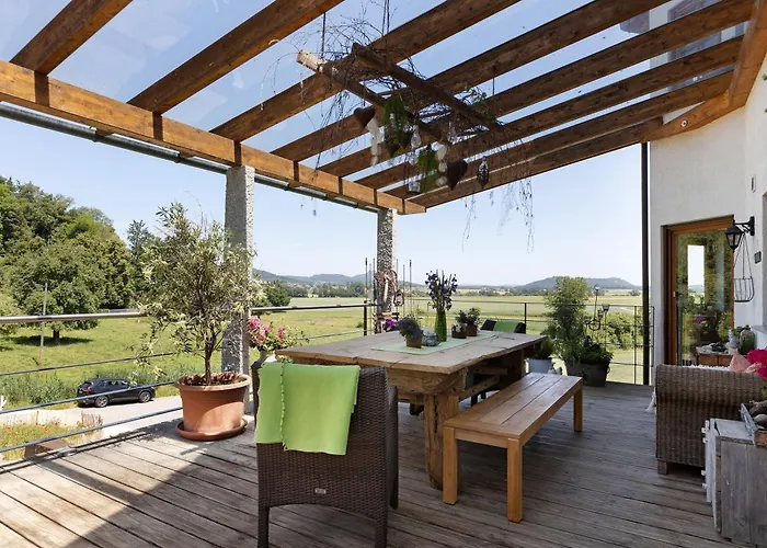 Die 2-Zimmer- Villa Almschlössle Randegg liegt in einer Entfernung von 4 km vom Morgetshofsee und verfügt über eine Terrasse mit Blick auf die Berge.